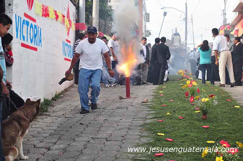 LA procesion salio sabado, desde la manana y entro hasta entrada la noche. Luego Salio el Domingo segun entiendo a las 10.00 AM y entro a la 1 AM del dia lunes. Hay tramos del recorridon donde la procesion avanza pocos metros y le sacan un torito, lo queman, sigue la procesion otros 20 metros, y sacan otro torito, asi trancurren entre 20 y 30 toritos, mas quema de polvora, marimba, etc. Increhible el colorido de esta procesion